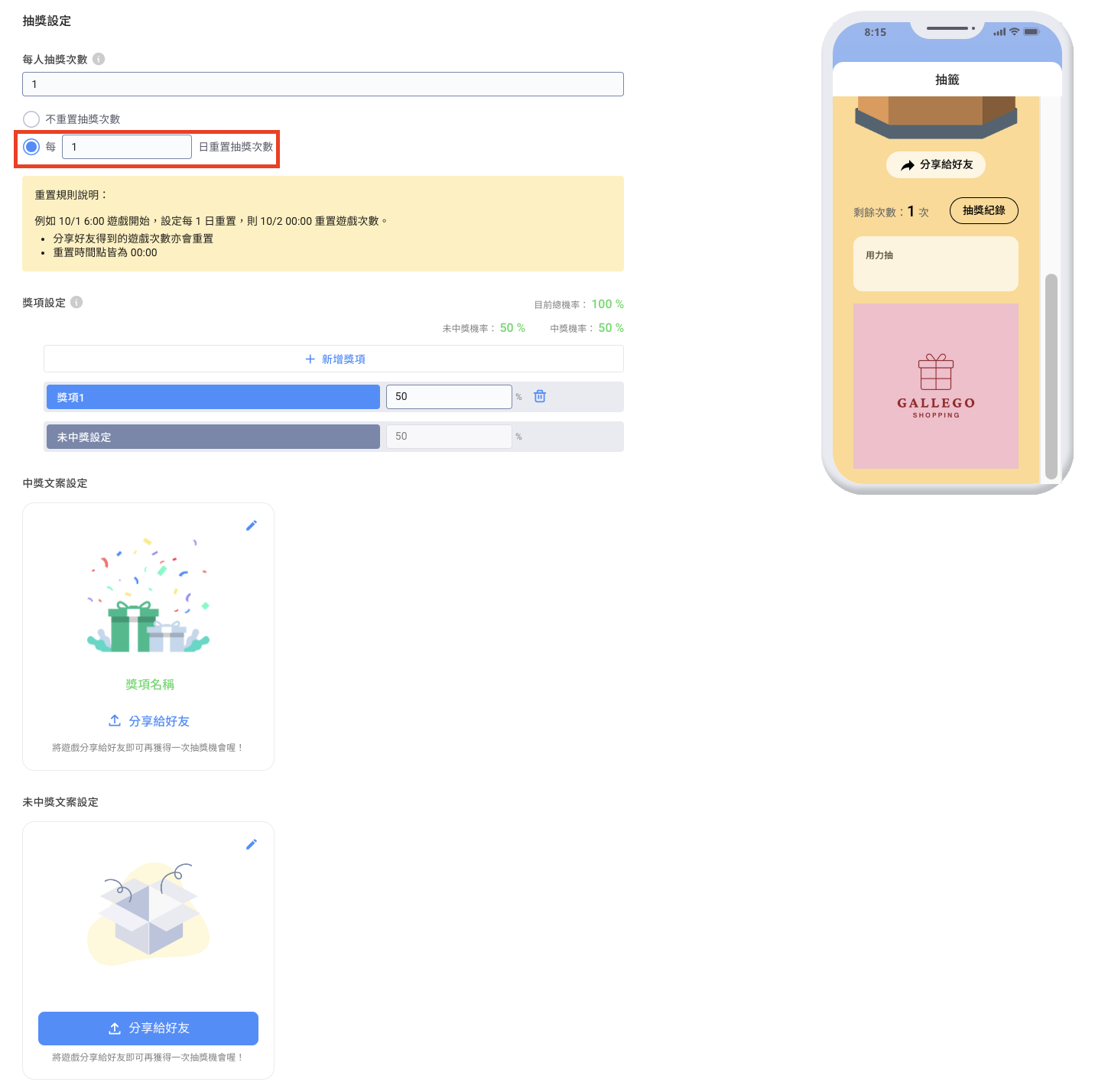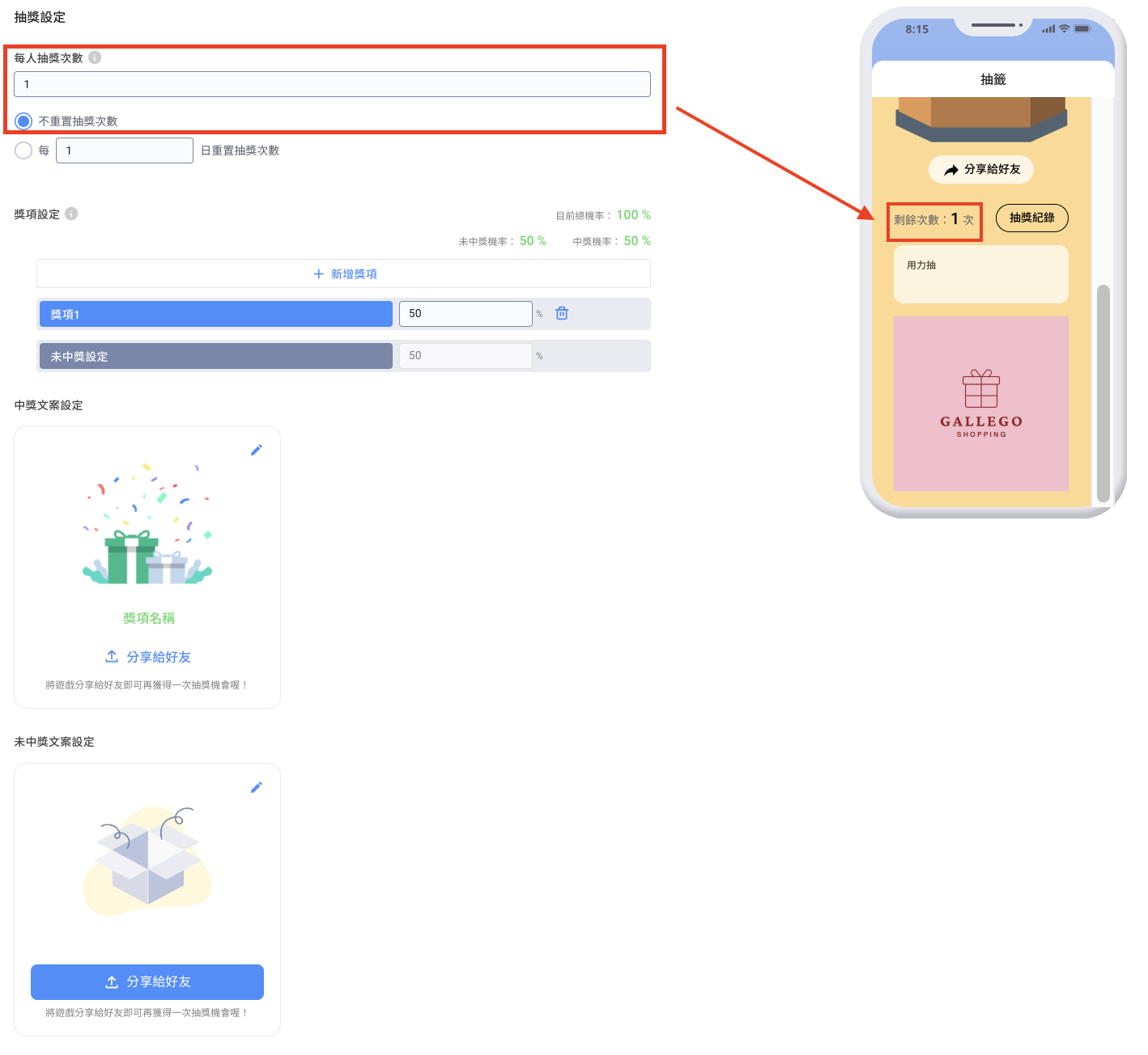 ### 步驟三：設定玩遊戲次數及獎項設定