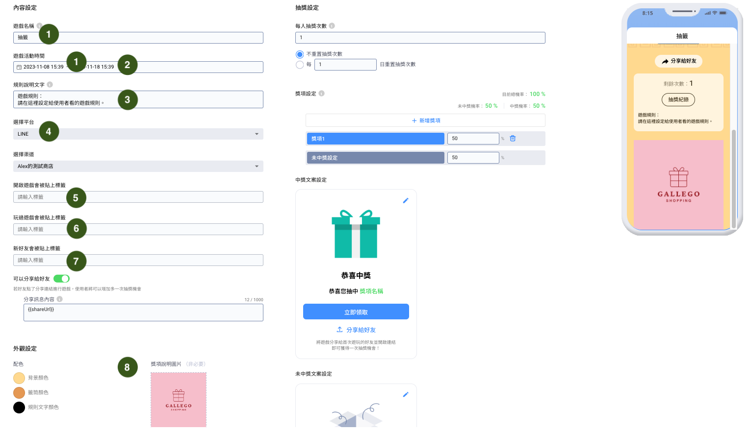 &#x20;6\.  中獎後發送訊息：遊戲中獎後可透過設定的渠道自動發送給得獎者（**注意：LINE 需收訊息費用**），並可使用聯絡人姓名參數功能