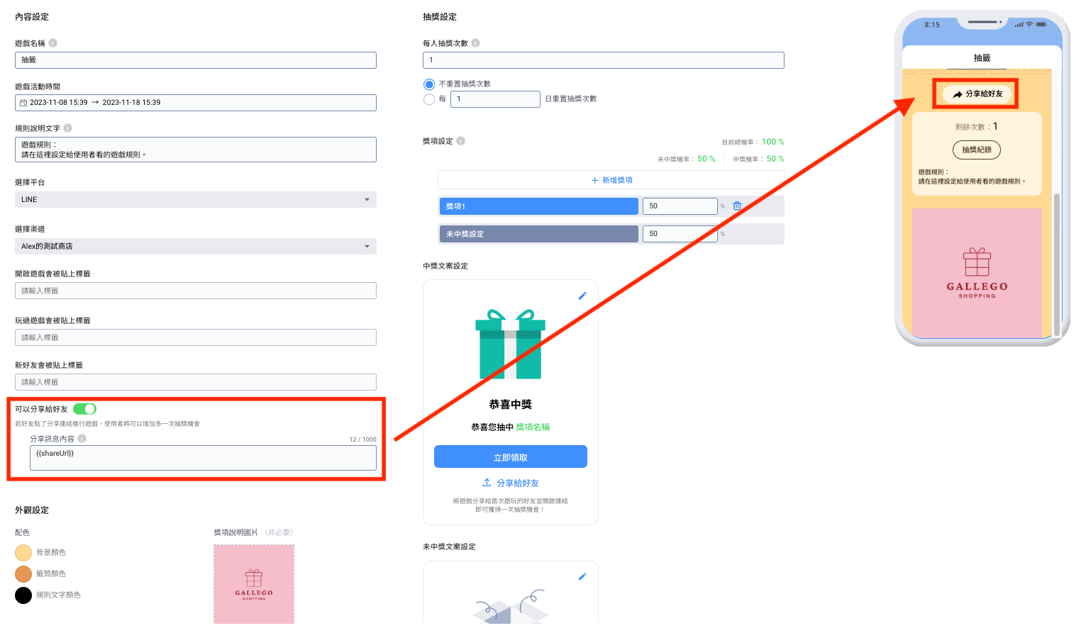 8\.  當開啟『是否分享給好友』這個功能，即當客人分享給他的好友（非好友也可以），***其好友為未玩過遊戲且透過手機點選連結並完成遊戲時***，即可多增加一次抽獎機會&#x20;