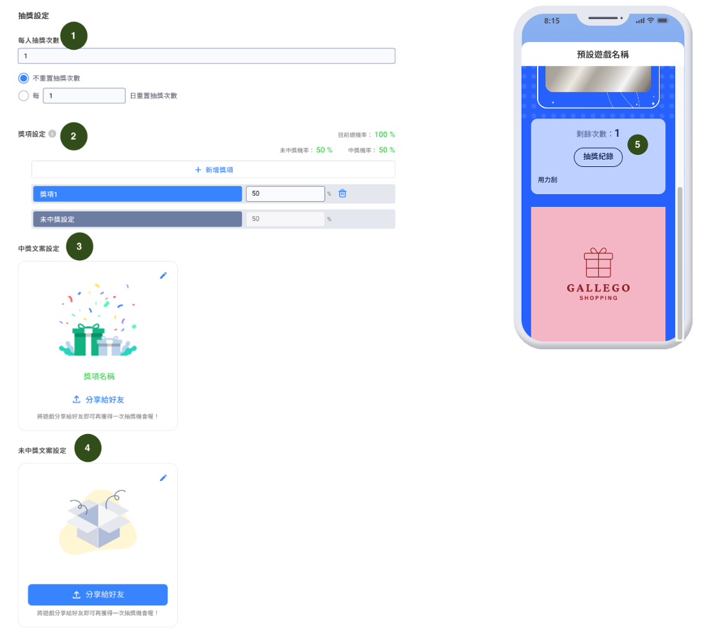 * 未中獎名稱：不用受限於名稱，如您希望參與的遊戲的人都可以有獎項，此設定亦可為「參加獎」