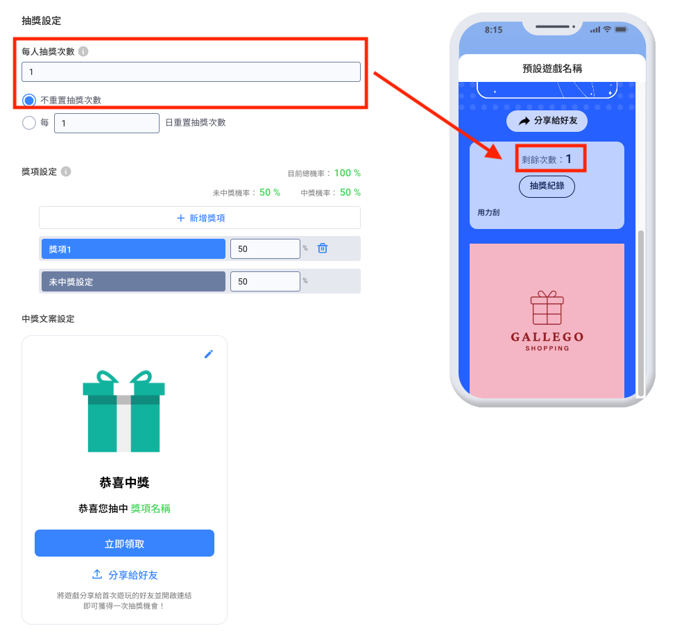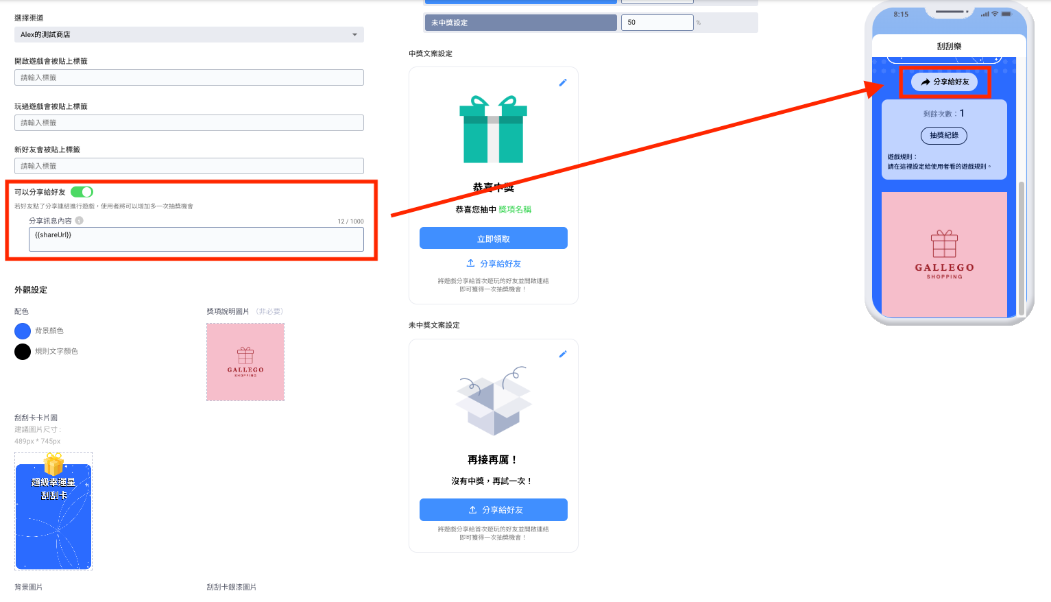 8\.  當開啟『是否分享給好友』這個功能，即當客人分享給他的好友（非好友也可以），***其好友為未玩過遊戲且透過手機點選連結並完成遊戲時***，即可多增加一次抽獎機會&#x20;