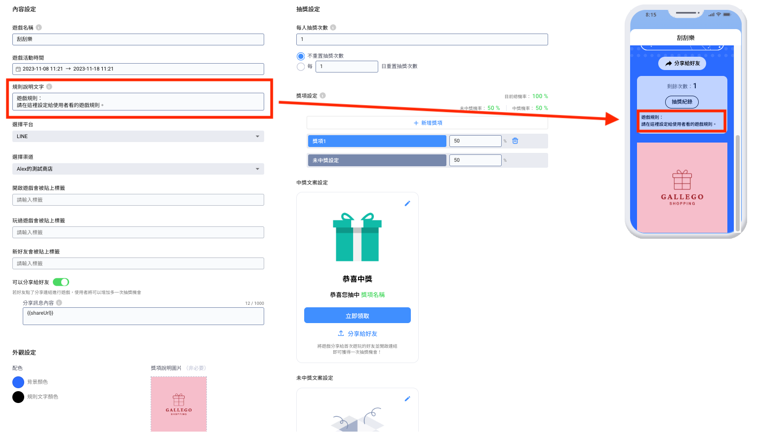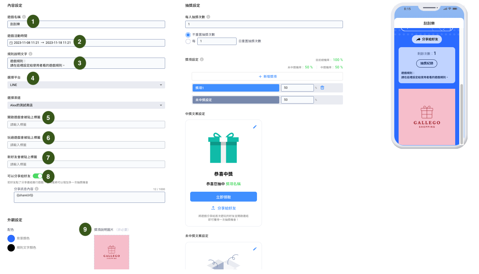 &#x20;6\.  中獎後發送訊息：遊戲中獎後可透過設定的渠道自動發送給得獎者（**注意：LINE 需收訊息費用**），並可使用聯絡人姓名參數功能