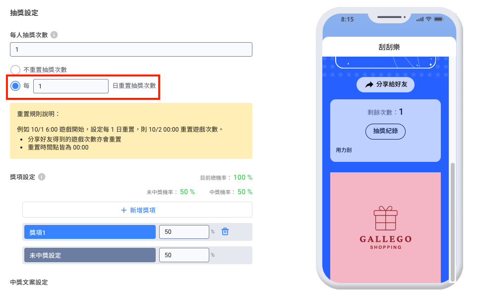 **可設定「每幾日」重置抽獎次數，時間一到客人將會重新獲得抽獎機會**