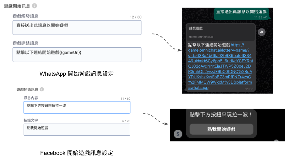 **\*遊戲開始訊息**：當您選擇在 **Facebook、Instagram** 或是 **WhatsApp** 平台，可以自訂彈出遊戲訊息文字和按鈕文字