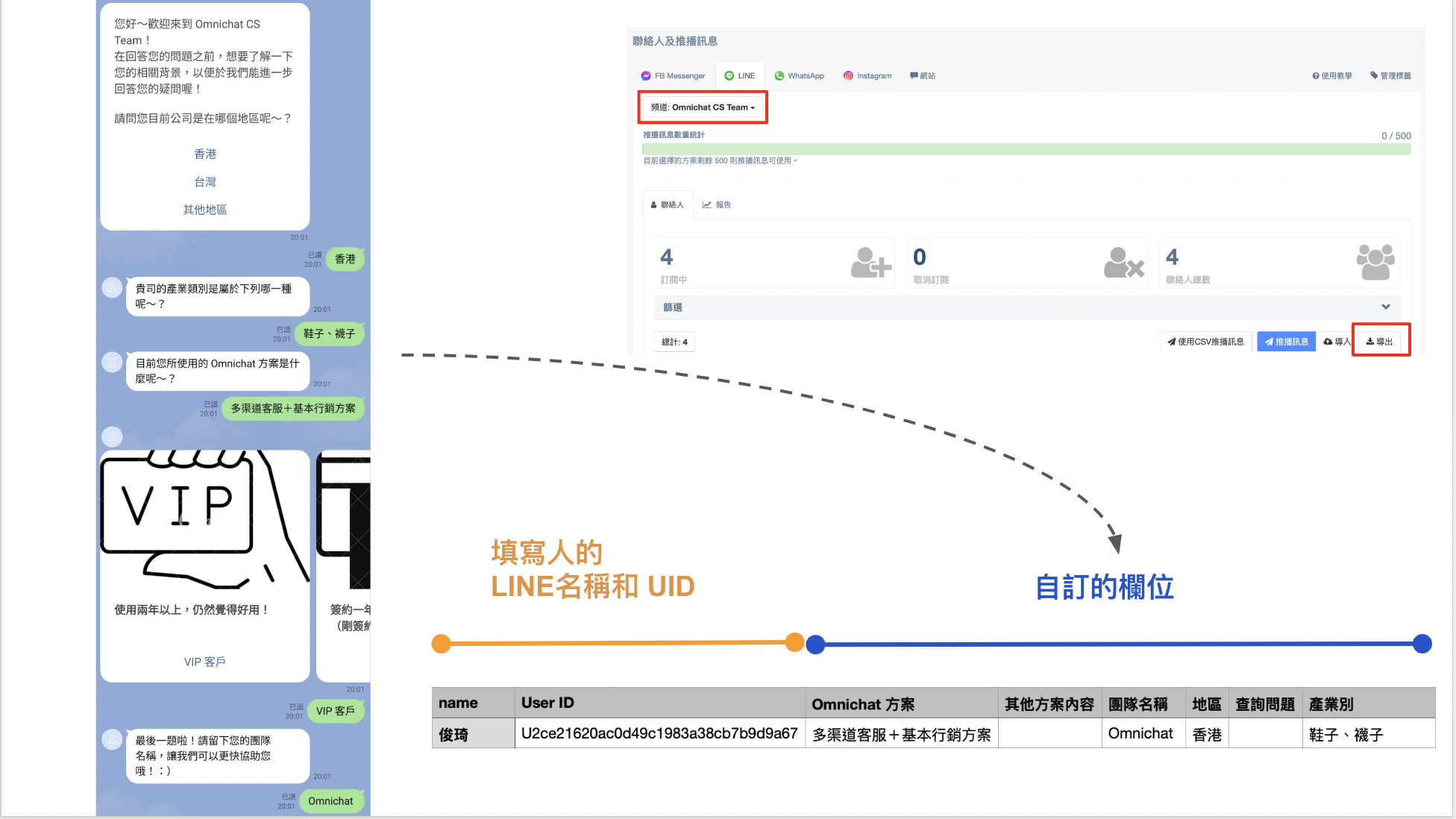 消費者回答問題後可將資料留在聯絡人中，需至『聯絡人及推播訊息』內在相對應的社群帳號中『導出』設定好的自訂欄位跟資料。