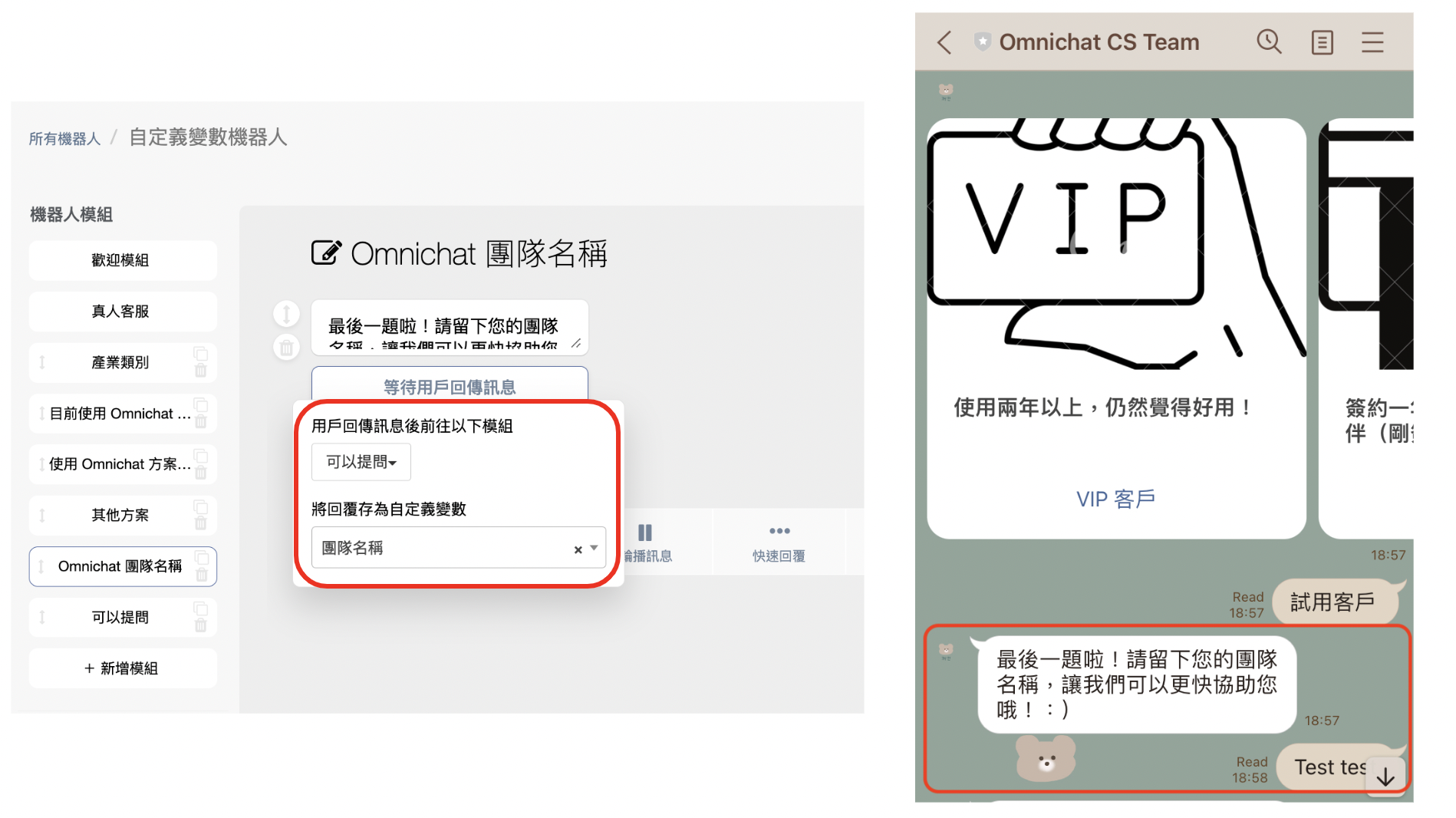 當消費者手動輸入文字訊息「Test test」，就會在「團隊名稱」這個欄位底下填入「Test test」
