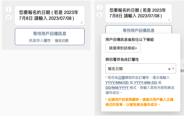 使用機器人卡片時除了設計問題讓客人回覆以外，可以利用自訂屬性方式紀錄客人資料