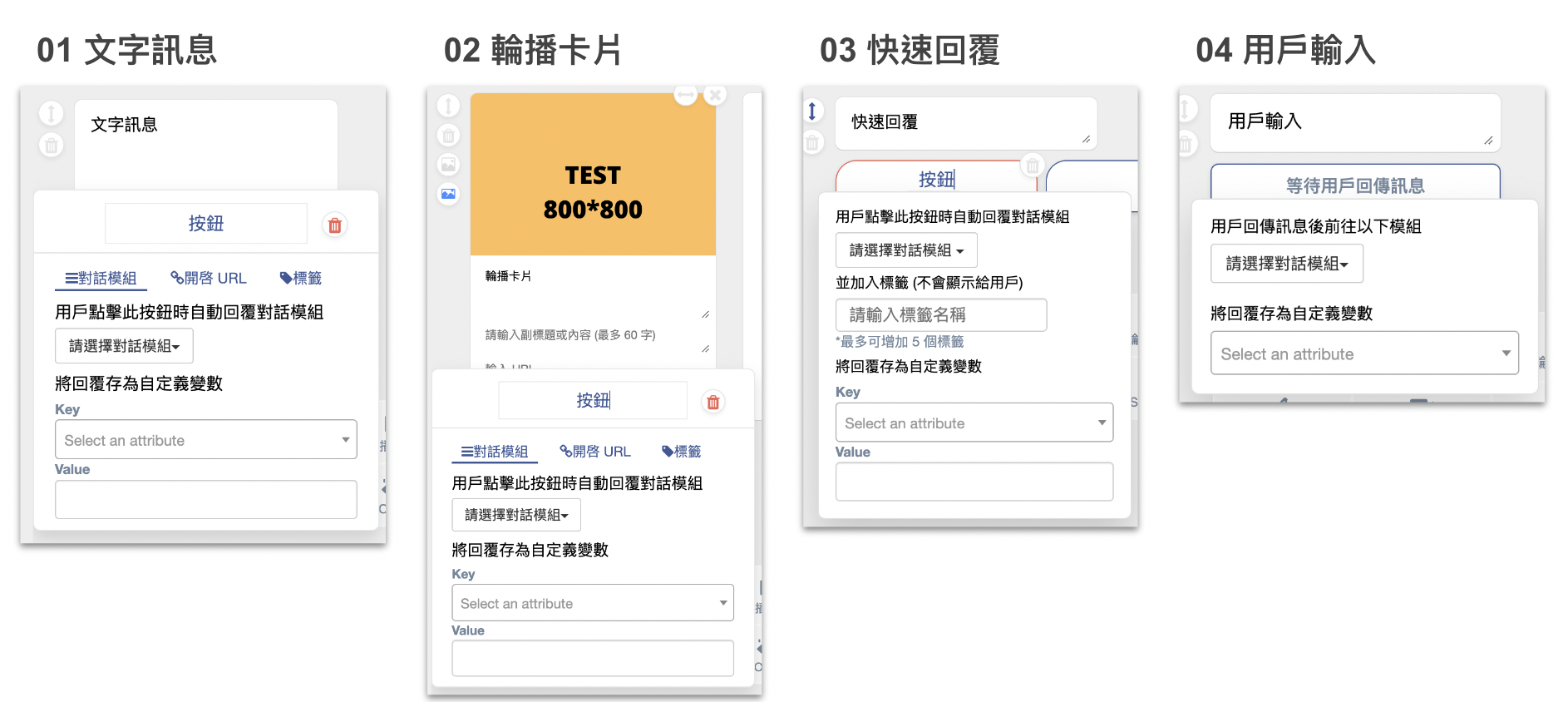 文字訊息卡片、輪播訊息卡片、快速回覆卡片和用戶輸入卡片。