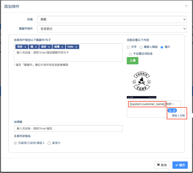 選擇以「**文字**」或「**圖片+文字**」回覆時，可以點選文字輸入框右下的藍色框框選取【聯絡人名稱】，系統會在內容中帶入 {{system:cutomer\_name}} 的姓名參數，會自動抓取聯絡人社群名稱。