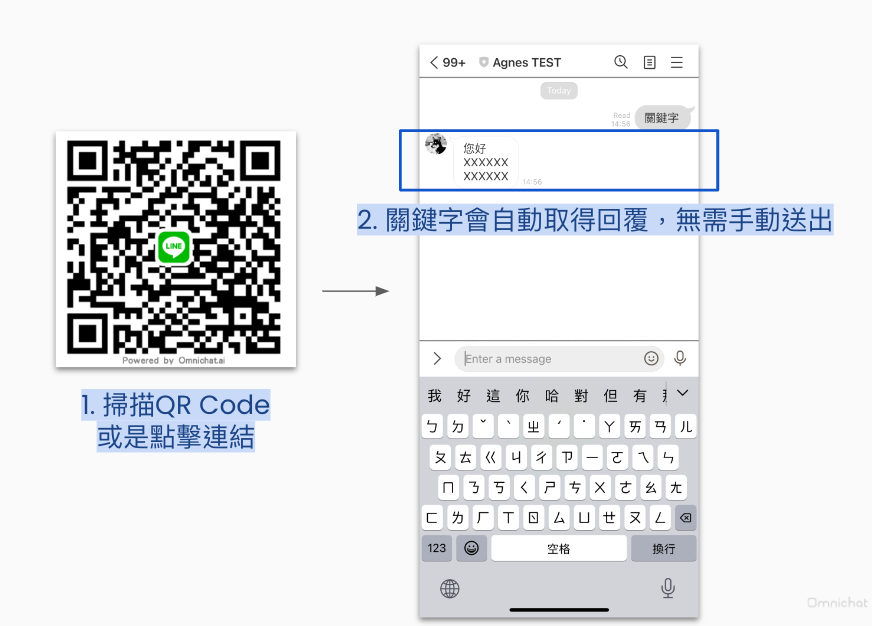 步驟二：消費者掃描 QRcode 會在對話輸入框出現設定好的關鍵字詞，當消費者發送關鍵字，就會觸發已經設定好的自動回覆內容
