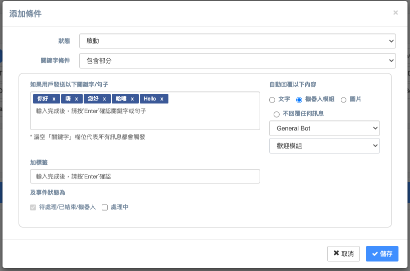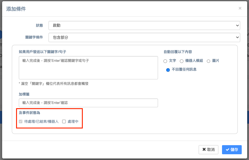若勾選「處理中」的事件狀態，則代表當真人客服已經跟進該事件時，設定的關鍵字條件會被觸發。