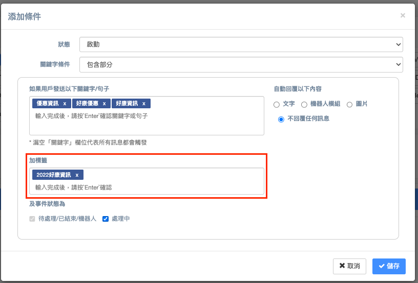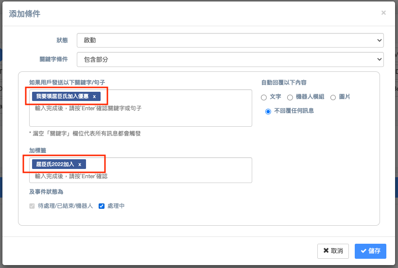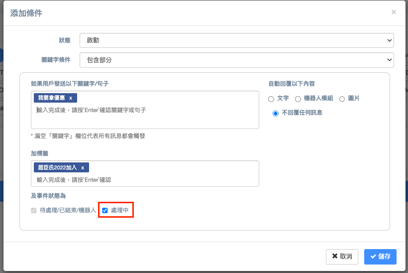 2. 「處理中」 的對話我們視為已經由真人接手，除非在設定條件時的『及事件狀態為』有勾選『處理中』，否則不會觸發關鍵字回覆。