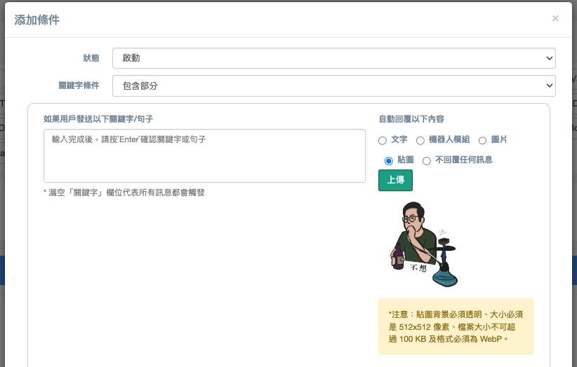 注意：貼圖背景必須是透明、大小必須是 512x512 像素、檔案大小不可超過 100 KB 及格式必須為 WebP。