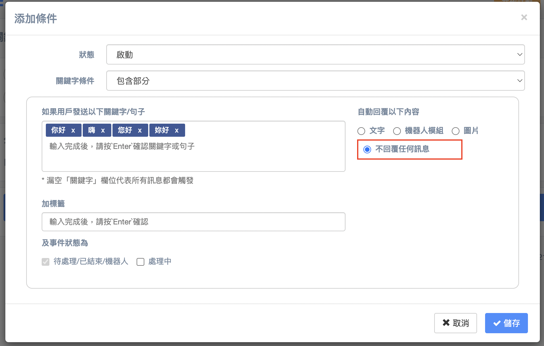 設定回覆內容為【**不回覆任何訊息**】可以針對消費者留言關鍵字後，對客戶加上標籤，並且不回覆任何訊息給消費者。