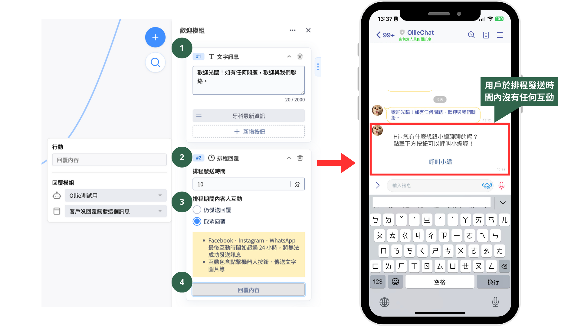 2. 在 WhatsApp、Facebook 和 Instagram 這三平台上，如客人**超過 24 小時**沒有回送訊息時， 排程回覆卡片將無法成功發送訊息（受限於 [Meta 24 小時政策](https://developers.facebook.com/docs/messenger-platform/policy/policy-overview/)），因此建議這三平台的排程發送時間不要設定超過 24 小時（1440分鐘）。