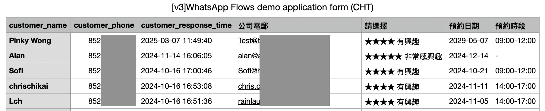 * 回應時間：客人完成 Flow 的時間（時間格式為：yyyy-MM-dd HH:mm:ss）