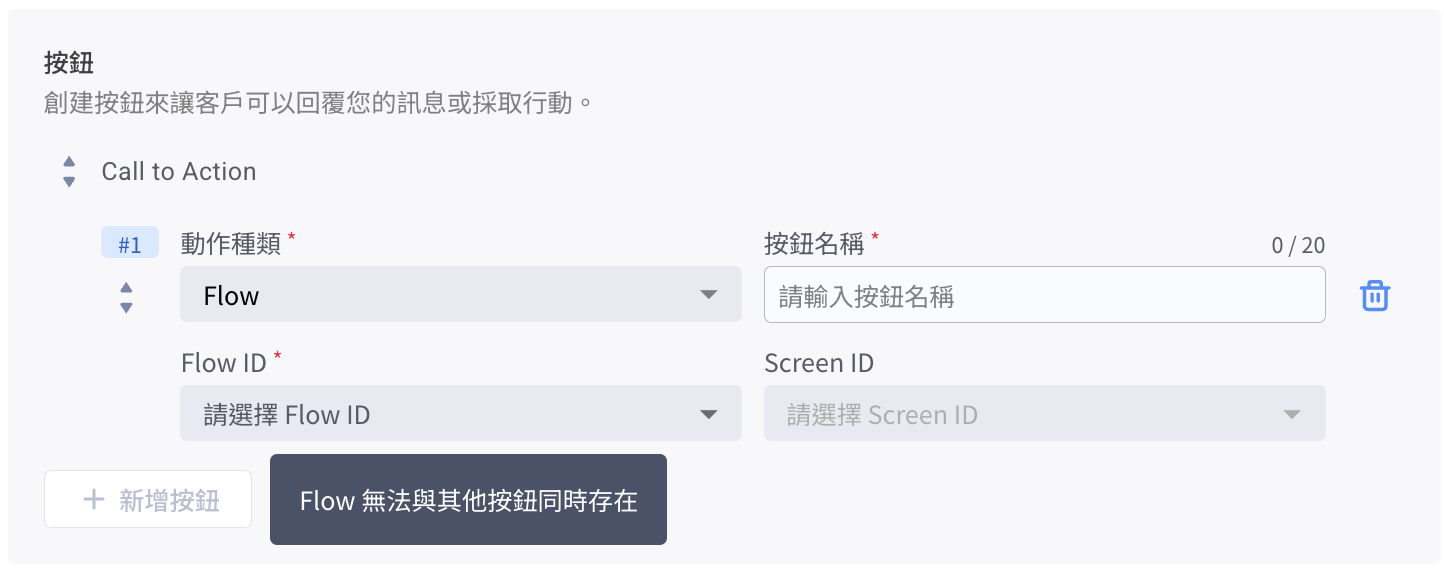 * 每個訊息範本僅能有一個 Flow 按鈕，且不能跟其他 CTA 按鈕共用。