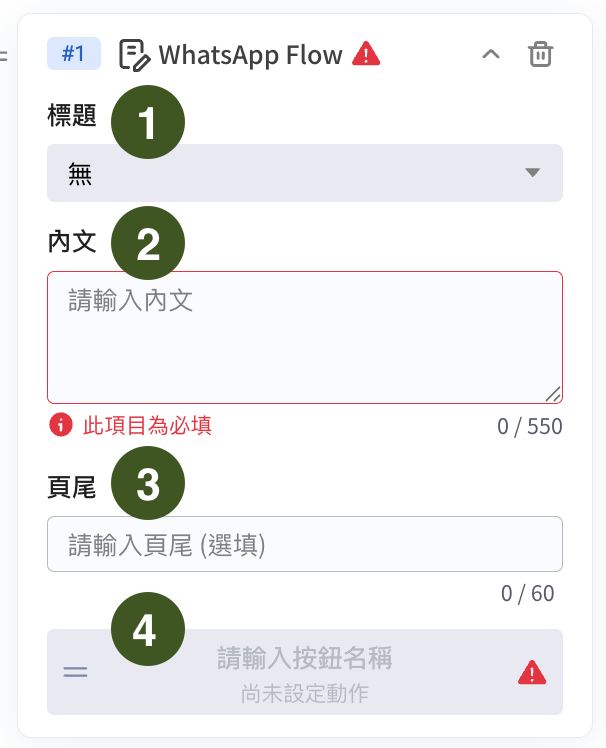 Flow 卡片僅限於 WhatsApp 使用，可以編輯的部分有四個區塊包含：