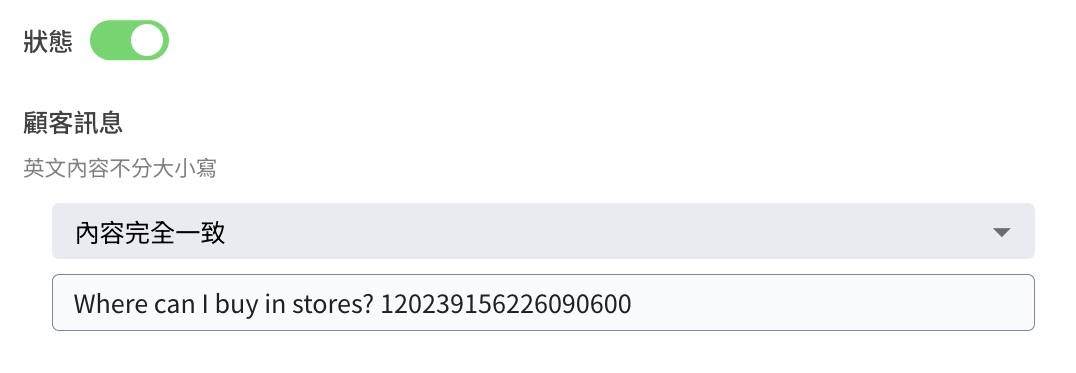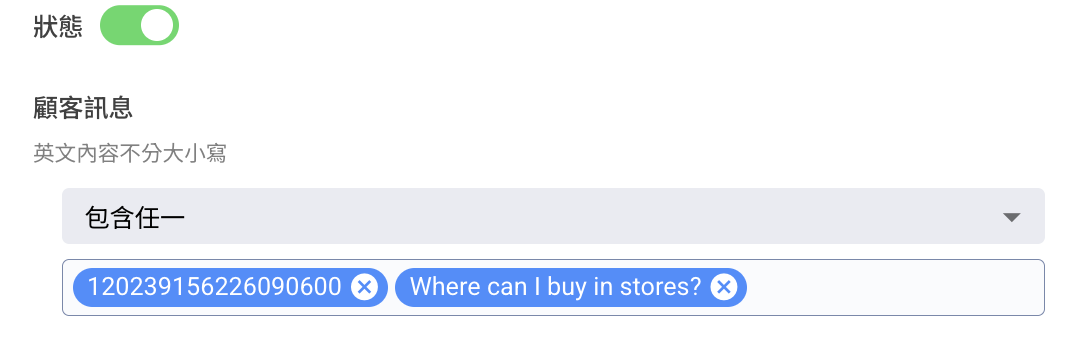 3. 包含任一：預填訊息 e.g: `Where can I buy in stores?`&#x20;