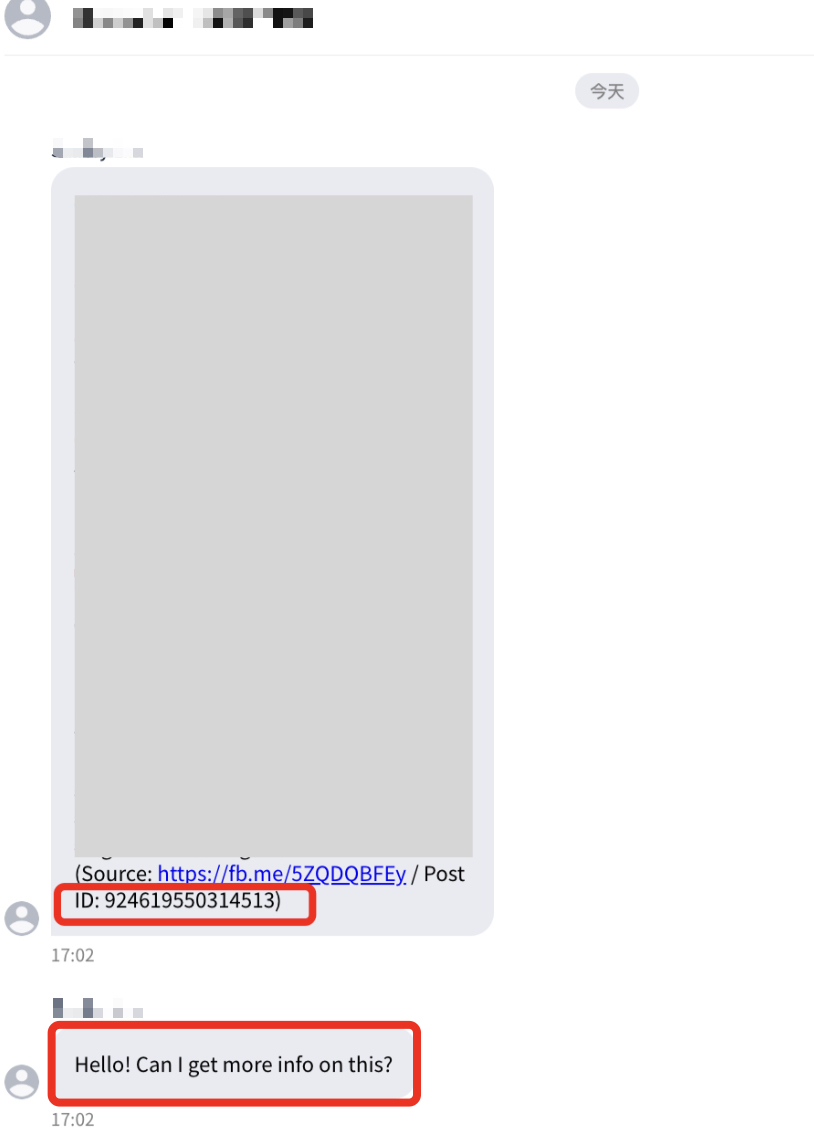 一般來說，透過FB/IG廣告進到Omnichat的對話，格式會分兩則訊息：