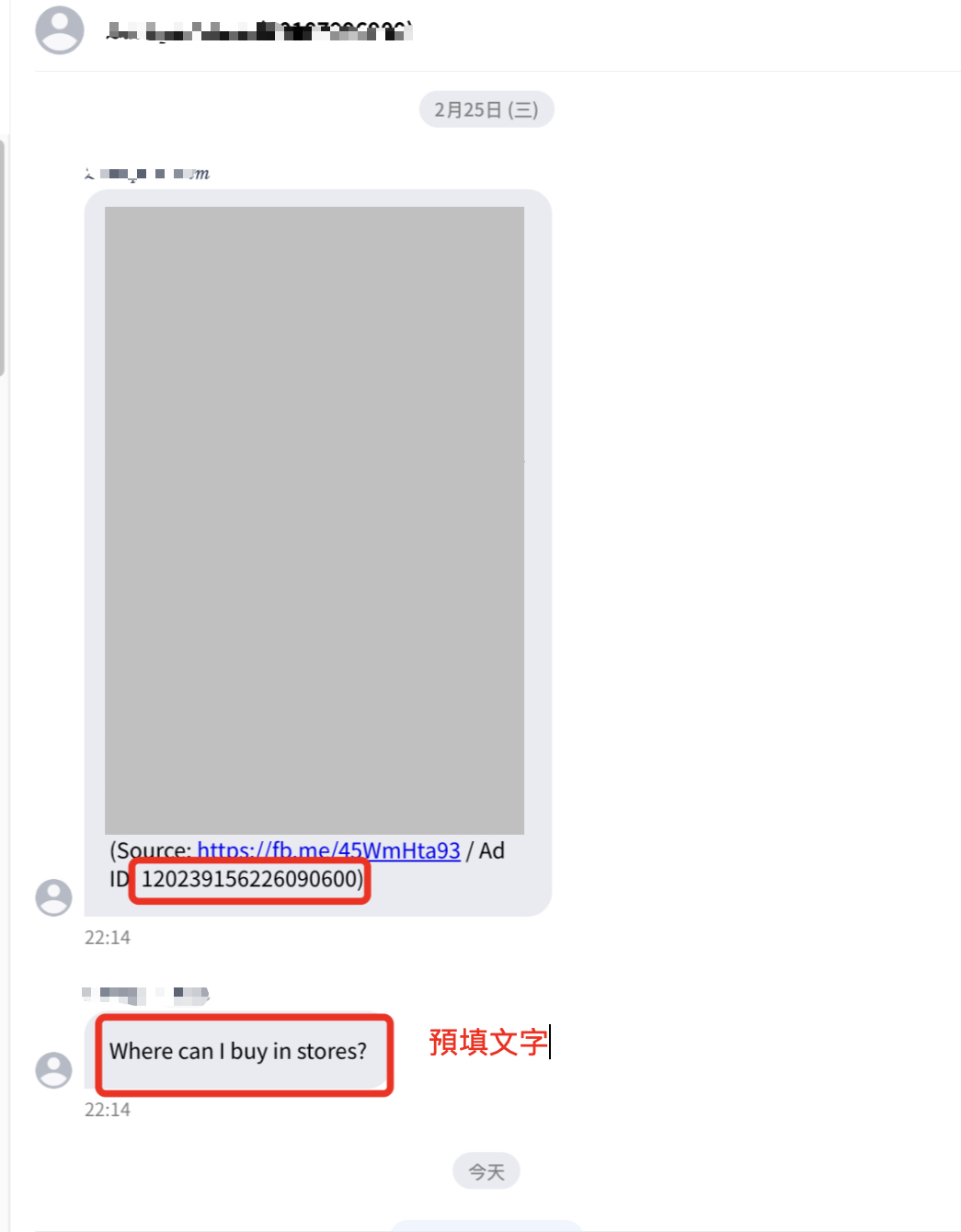 2. 第二則：預填訊息（品牌端可在設定廣告時填寫此段訊息，當顧客點擊廣告貼文進到聊天室時，對話輸入匡將預先填好這段文字）