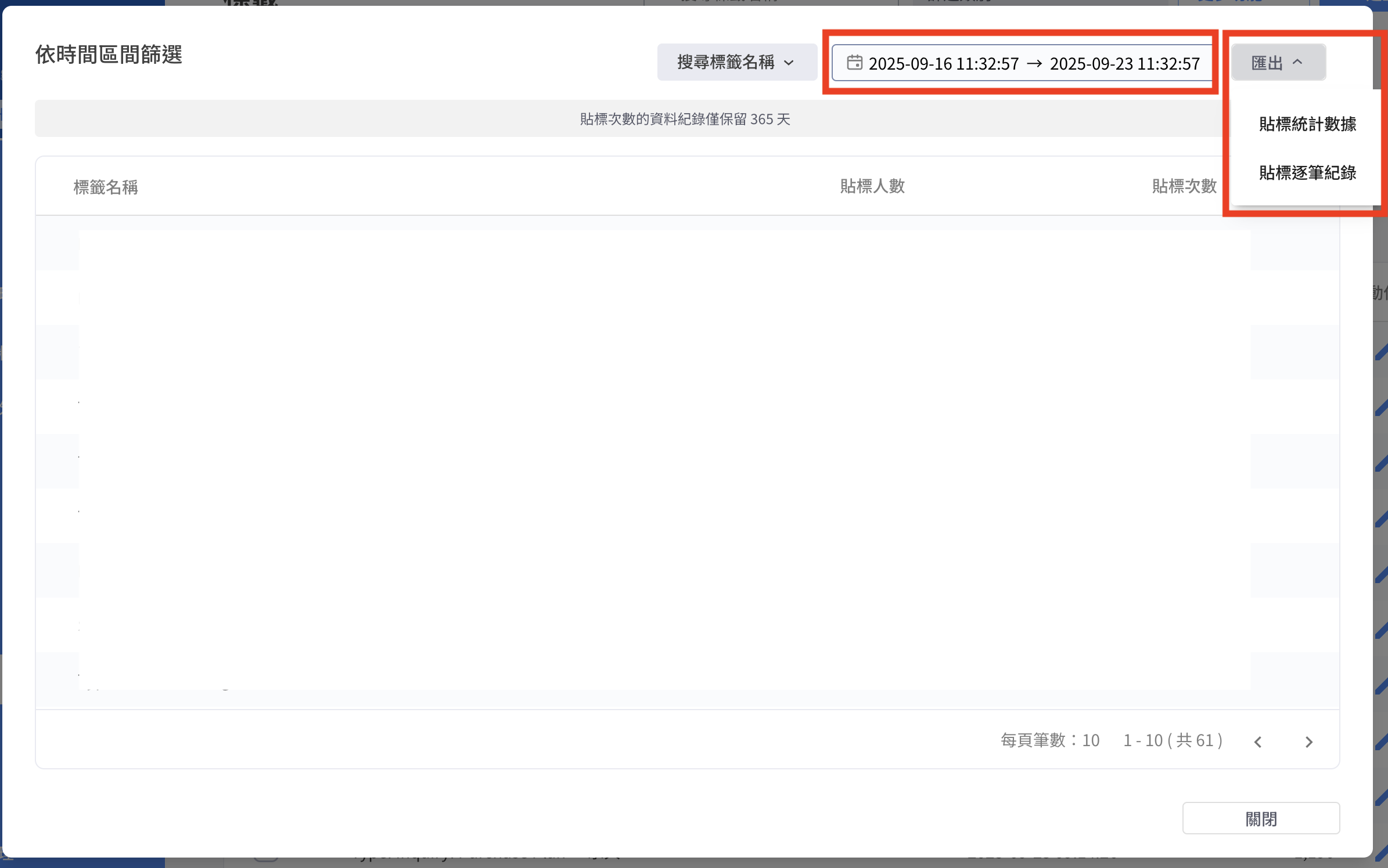 * 可以選擇時間區間，並匯出 **貼標統計數據** 或 **貼標逐筆紀錄**（查看每個客人在什麼渠道、透過什麽方式被貼上標籤）