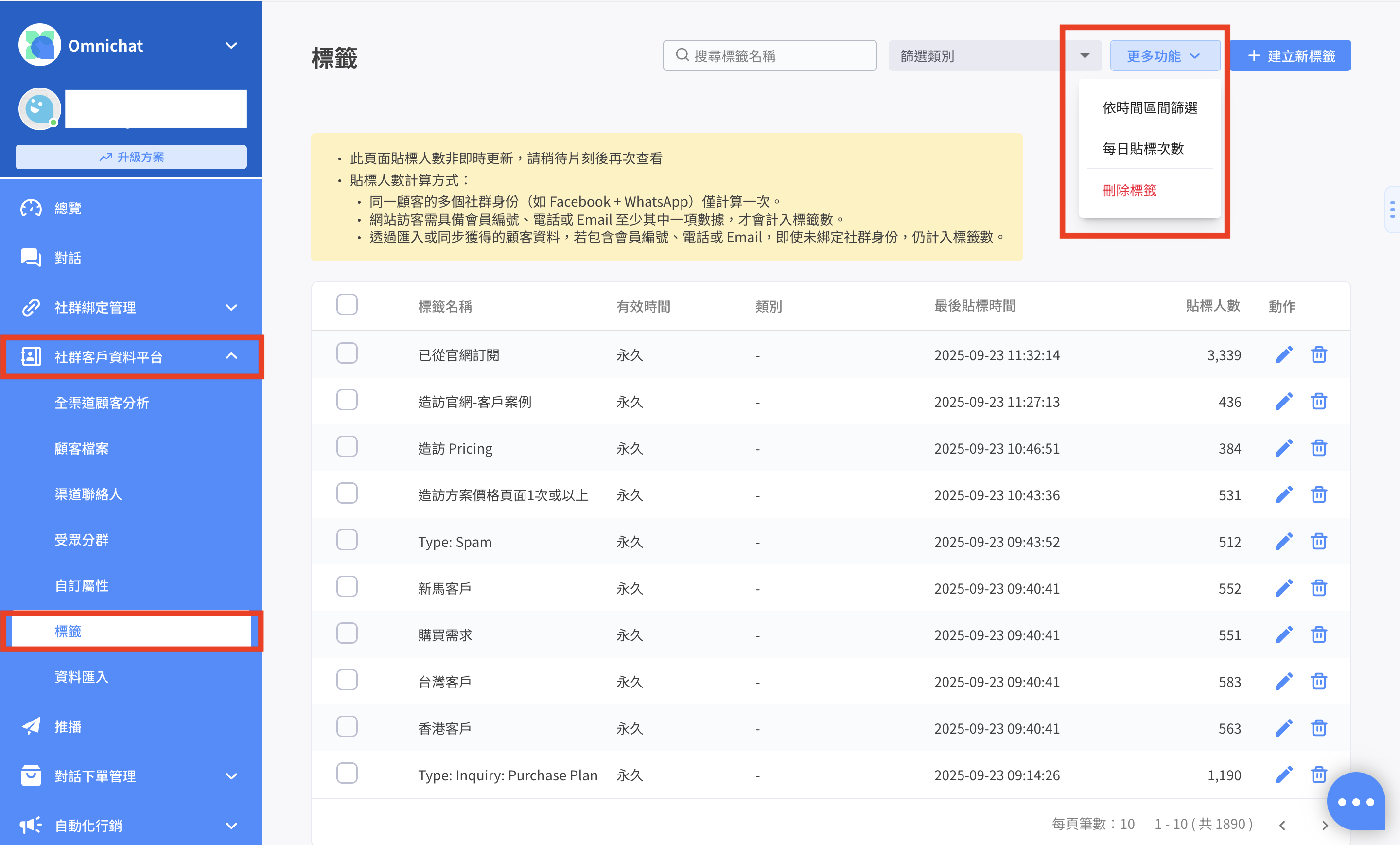 「[標籤](https://docs.omnichat.ai/features/she-qun-ke-hu-zi-liao-ping-tai/biao-qian)」 → **依時間區間篩選：**