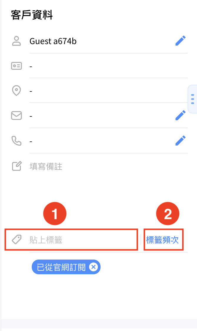 您可以點擊鉛筆符號，手動編輯 「客人名稱、郵件、電話，亦可以添加備註，記錄客人的其他資料」。