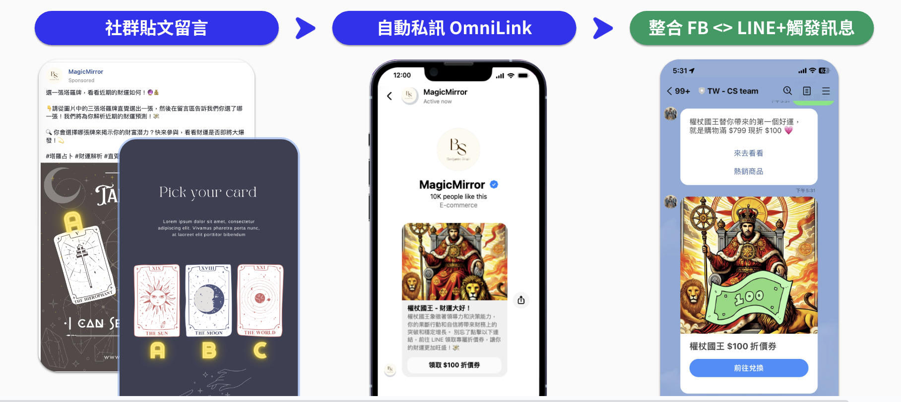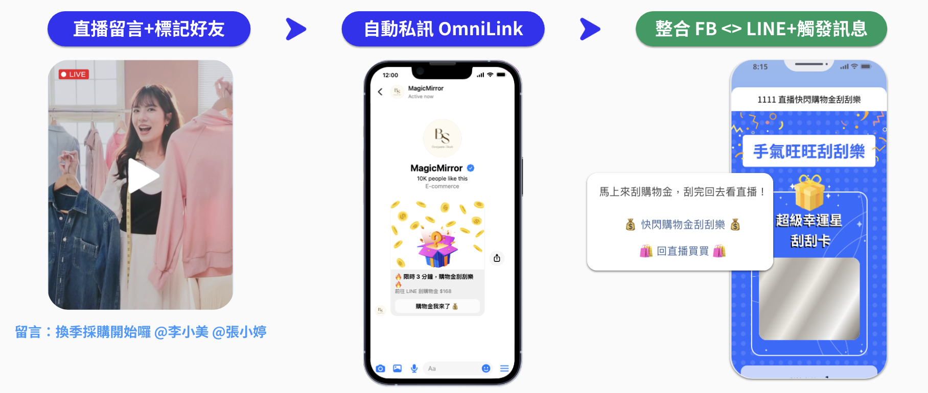 進行社群直播時，可以引導顧客留下指定關鍵字＋標記好友，符合條件自動私訊 OmniLink，再讓顧客前往 LINE 玩抽獎遊戲、領取優惠。炒熱直播氣氛同時完成 FB 聯絡人與 LINE 好友身份整合。