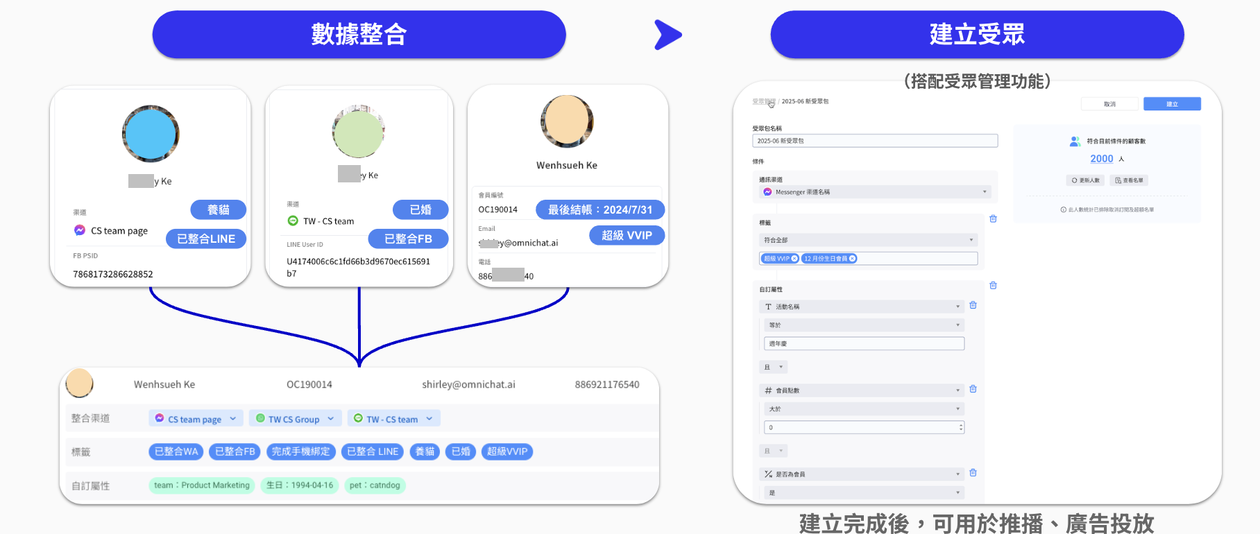 整合顧客 FB/IG 和 LINE 身份後，可依照顧客跨渠道的行為、數據，在 Omnichat 後台建立受眾，