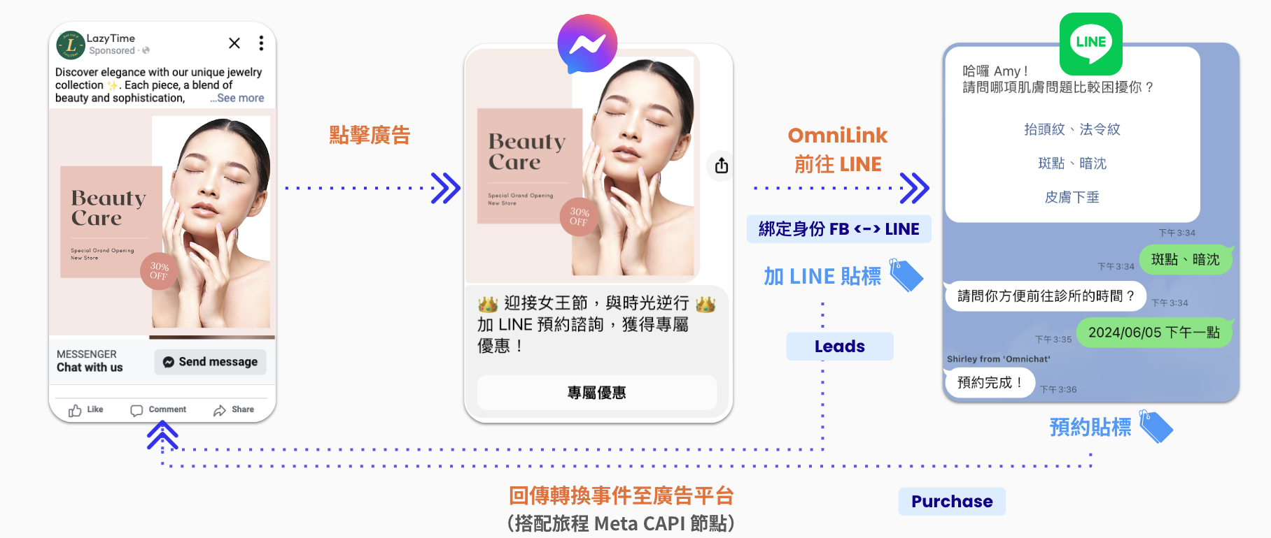 許多品牌會在 Meta 投放廣告，但以 LINE 作為深度互動平台，可以透過 OmniLink 將顧客從 Messenger 導入 LINE，跨渠道身份追蹤不中斷，在加好友、完成預約時，貼上標籤回傳轉換事件至廣告平台。