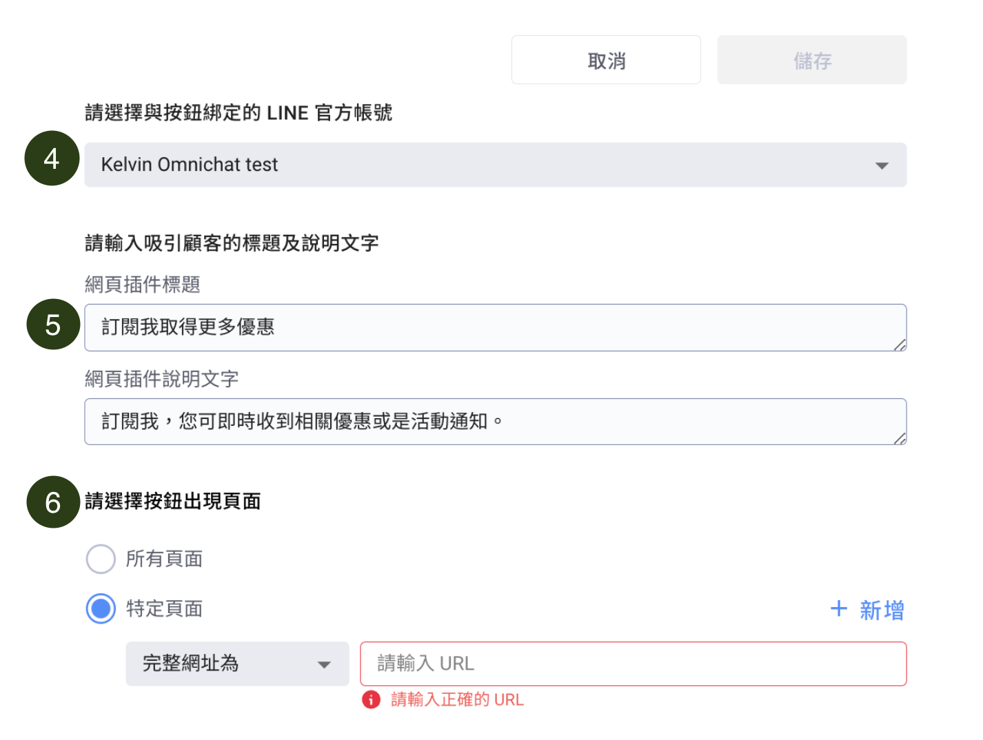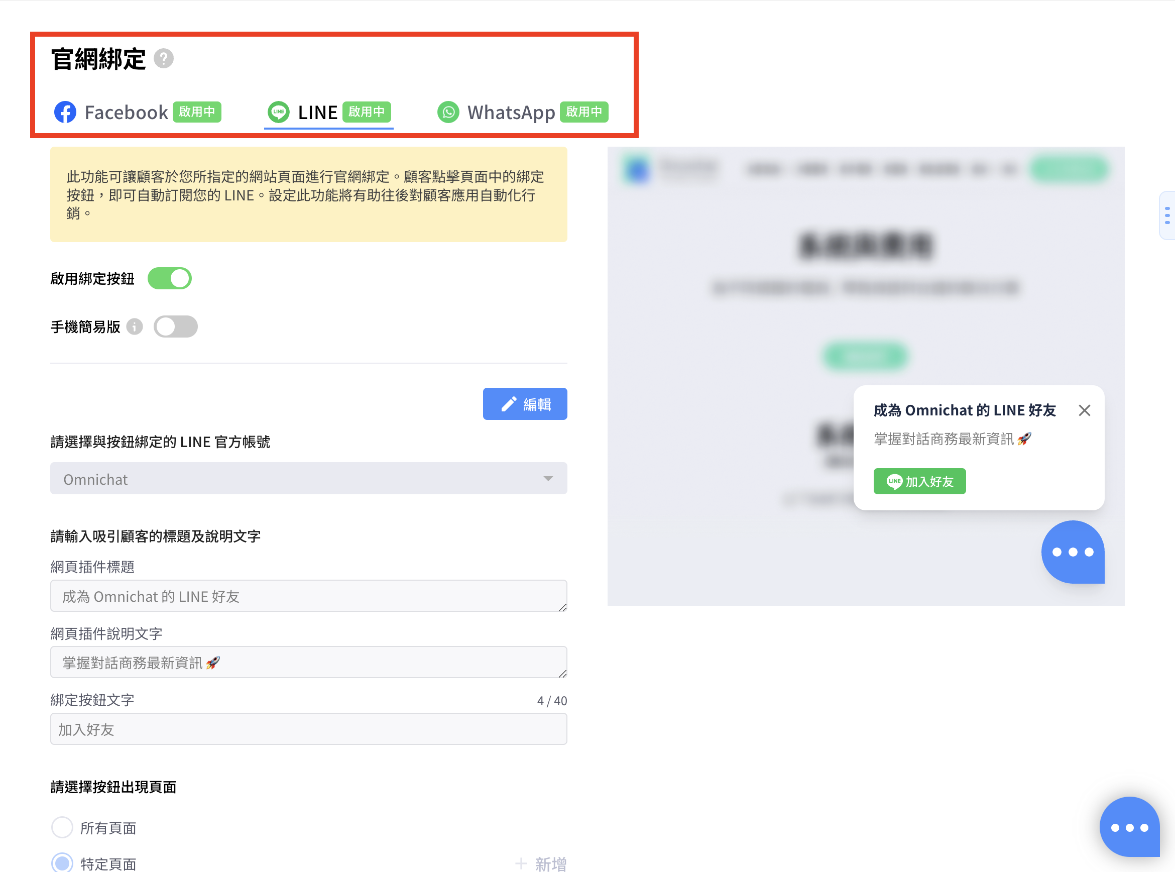 您亦可以設定官網綁定按鈕顯示在不同頁面，讓消費者綁定不同的社群渠道