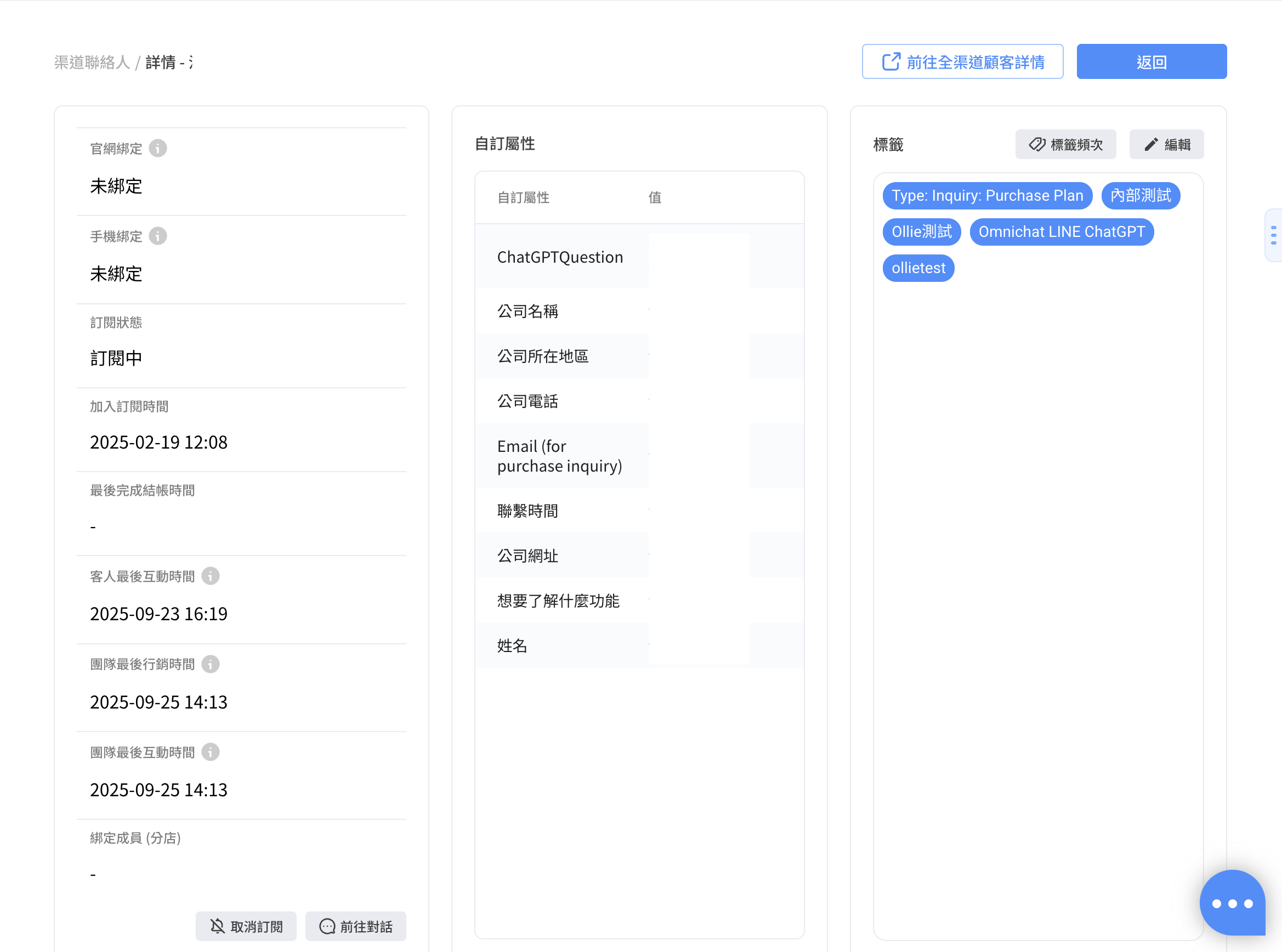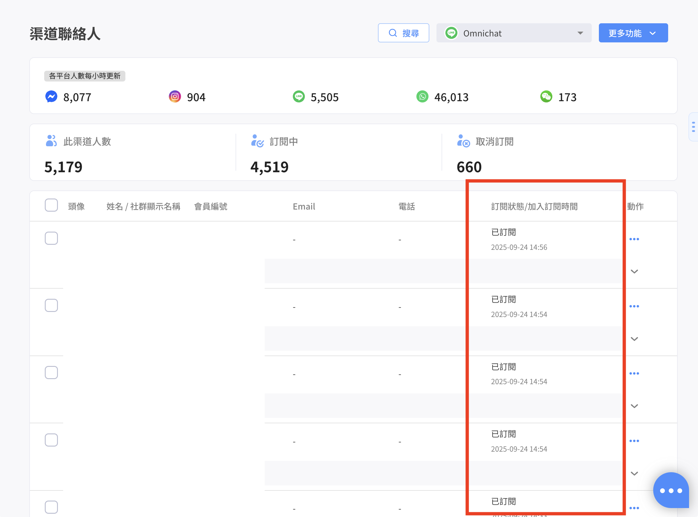在官網按下 「官網綁定按鈕」 的訪客，如果有完成後續的訂閱流程，會成為 **「有綁定身份」** 的聯絡人，您可以在後台 「[渠道聯絡人](https://docs.omnichat.ai/features/she-qun-ke-hu-zi-liao-ping-tai/qu-dao-lian-luo-ren)」 頁面，看到消費者的訂閱狀態、加入訂閱時間、是否綁定官網（於動作當中點擊看到更多）