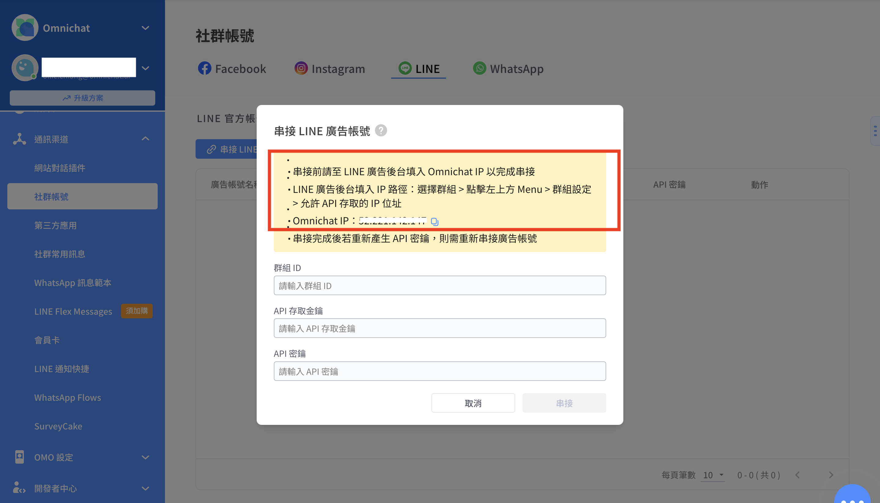 4. &#x20;關於取得 Omnichat IP 的路徑： 通訊渠道＞社群帳號 > LINE > LINE 廣告帳號