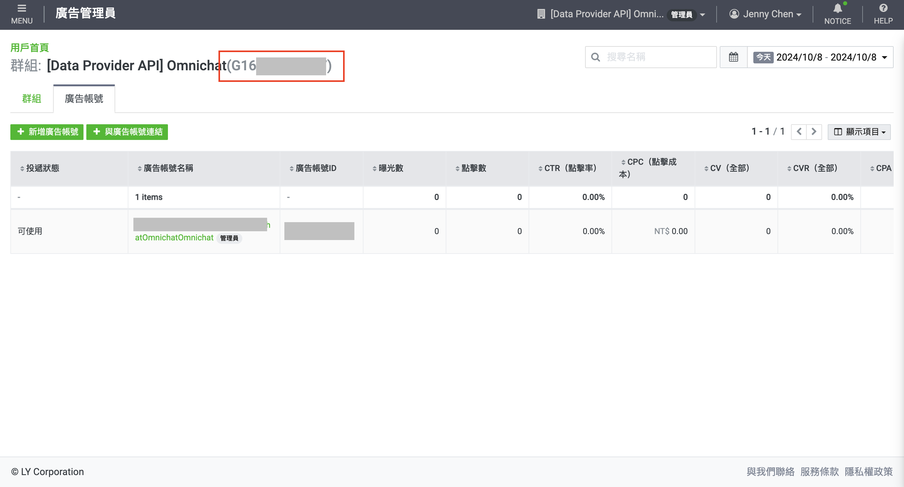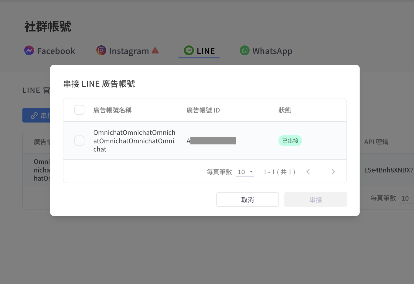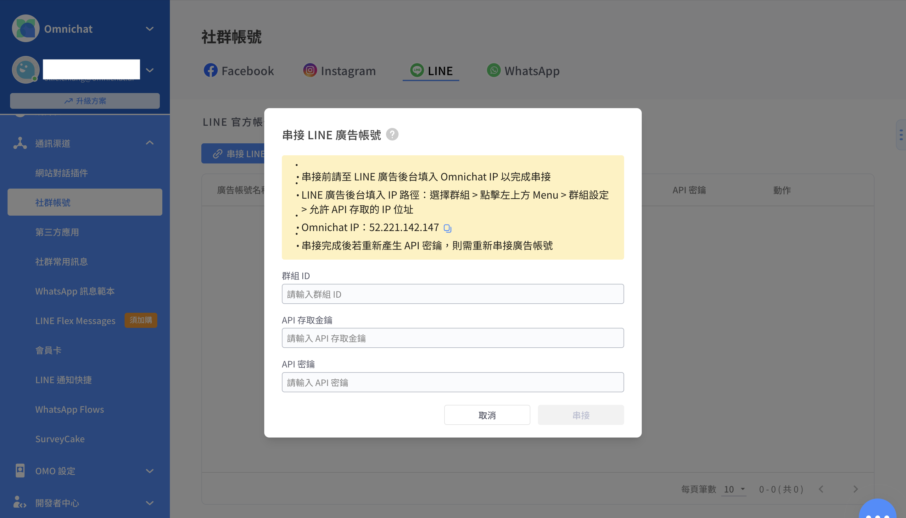 Omnichat 系統後台**通訊渠道 > 社群帳號 > LINE > LINE 廣告帳號**