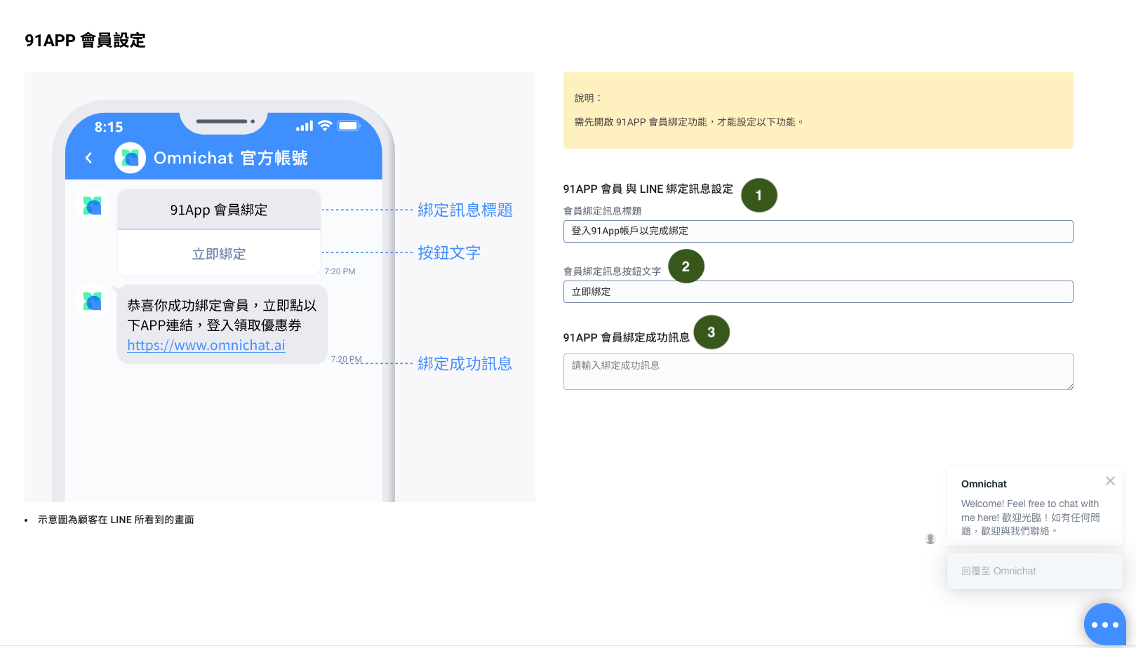 &#x20;如您不清楚如何完成 91APP 後台設定，您可以參考這裡的教學說明：[完成 91APP 後台設定](https://docs.omnichat.ai/marketing/chatbot-builder/ji-qi-ren-mo-zu-91app-yong-hu-xian-ding#ru-he-zai-line-guan-fang-zhang-hao-zhong-jiao-chu-ji-qi-ren-mo-zu)