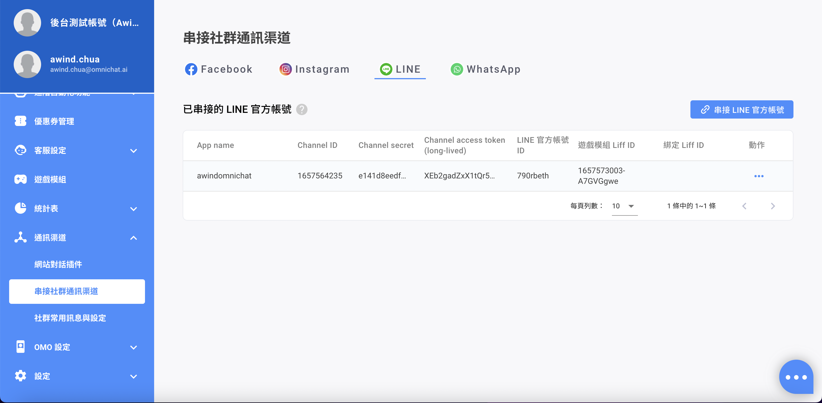 步驟一 先將帳號(藍盾以上)接至 Omnichat 後台。