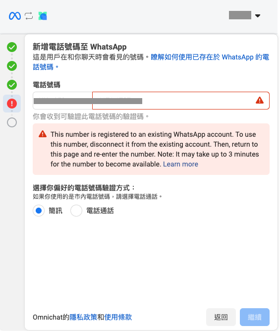 若您出現以下的錯誤提示，則代表您填寫的號碼已經有申請過 Whatsapp 個人版、Whatsapp 商業版，其中一種帳號類型。需要先刪除目前這個號碼正在使用中的帳戶，才可以繼續串接，刪除說明請參考：[Whasapp 官方說明頁面](https://faq.whatsapp.com/2138577903196467/?cms_platform=android)。