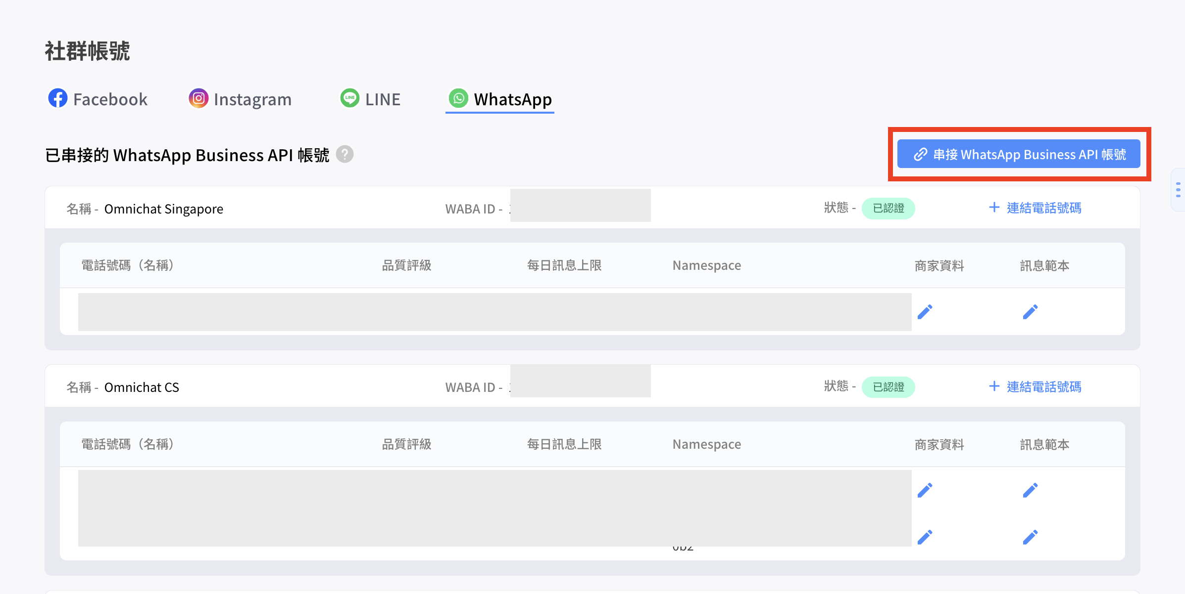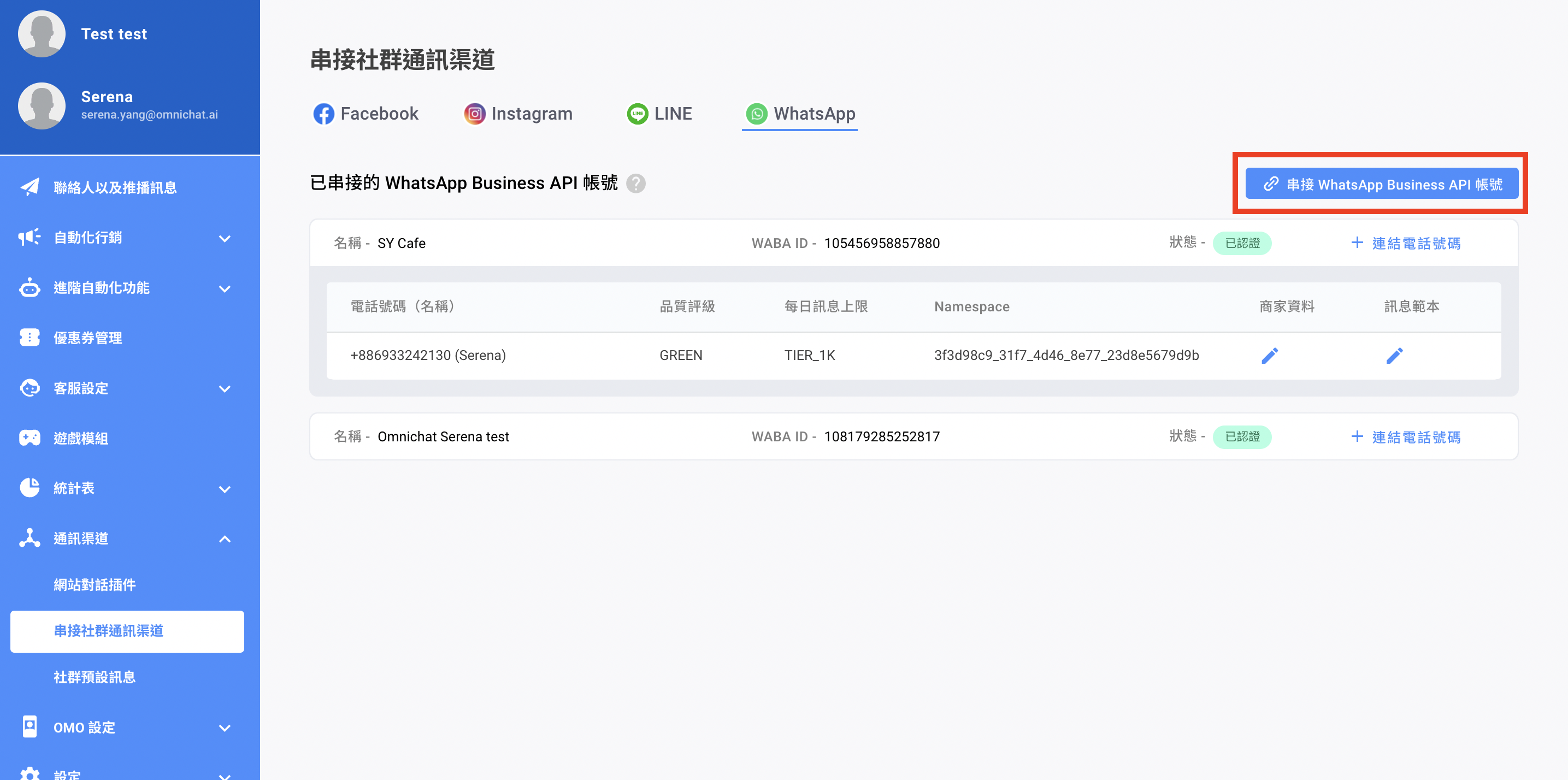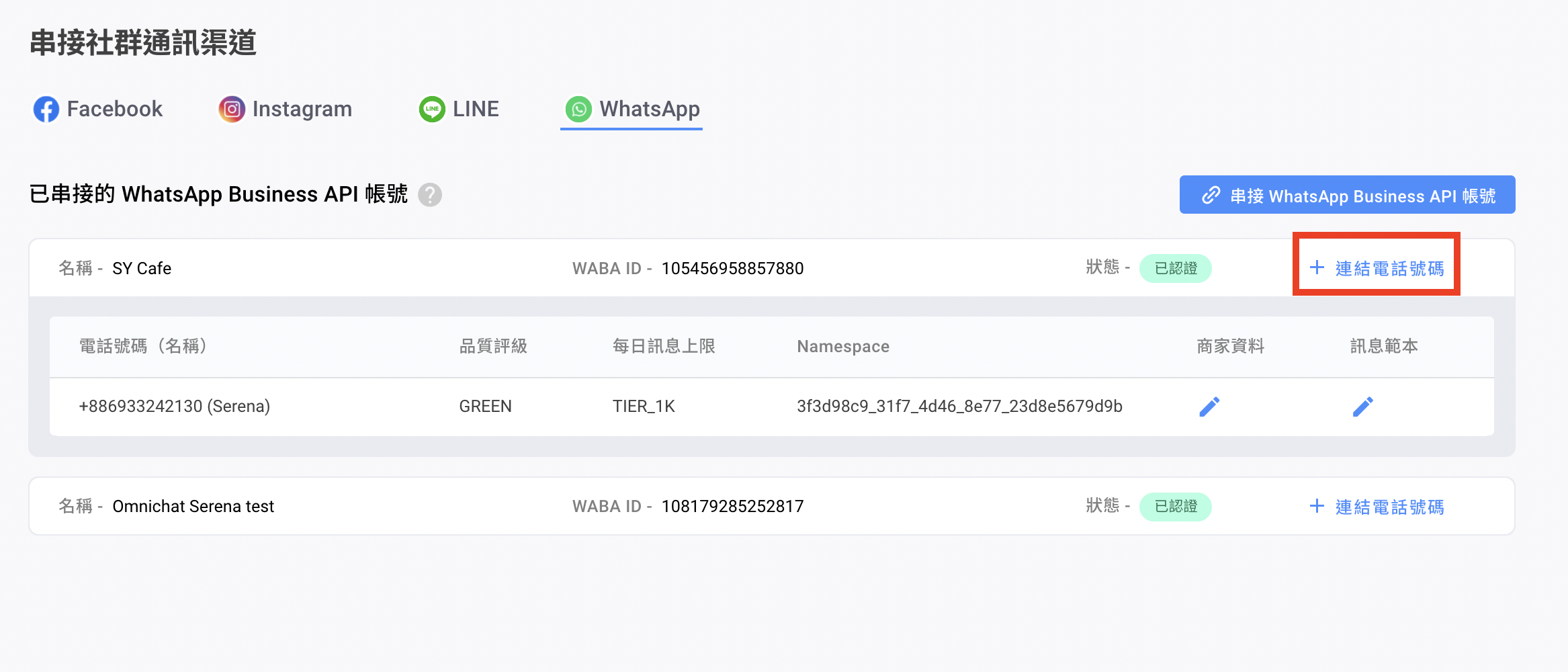 回到 Omnichat 後台，到「通訊渠道」-> 「串接通訊渠道」-> 點開 WhatsApp 串接。在「Shared WhatsApp Business Account」按下『更新』。您會找到您剛剛設定的 WhatsApp 帳戶號碼，按下『連接電話號碼』