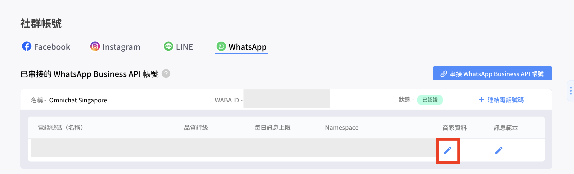 **從 「通訊渠道」** → **「社群帳號」** → **「WhatsApp 」** → **點擊鉛筆圖示**