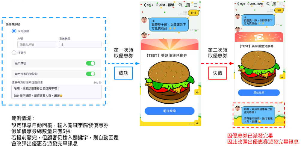 1. 優惠券正式發送期間未到、發送期間已過或所有優惠券已送出，此優惠券卡片將不會發送。