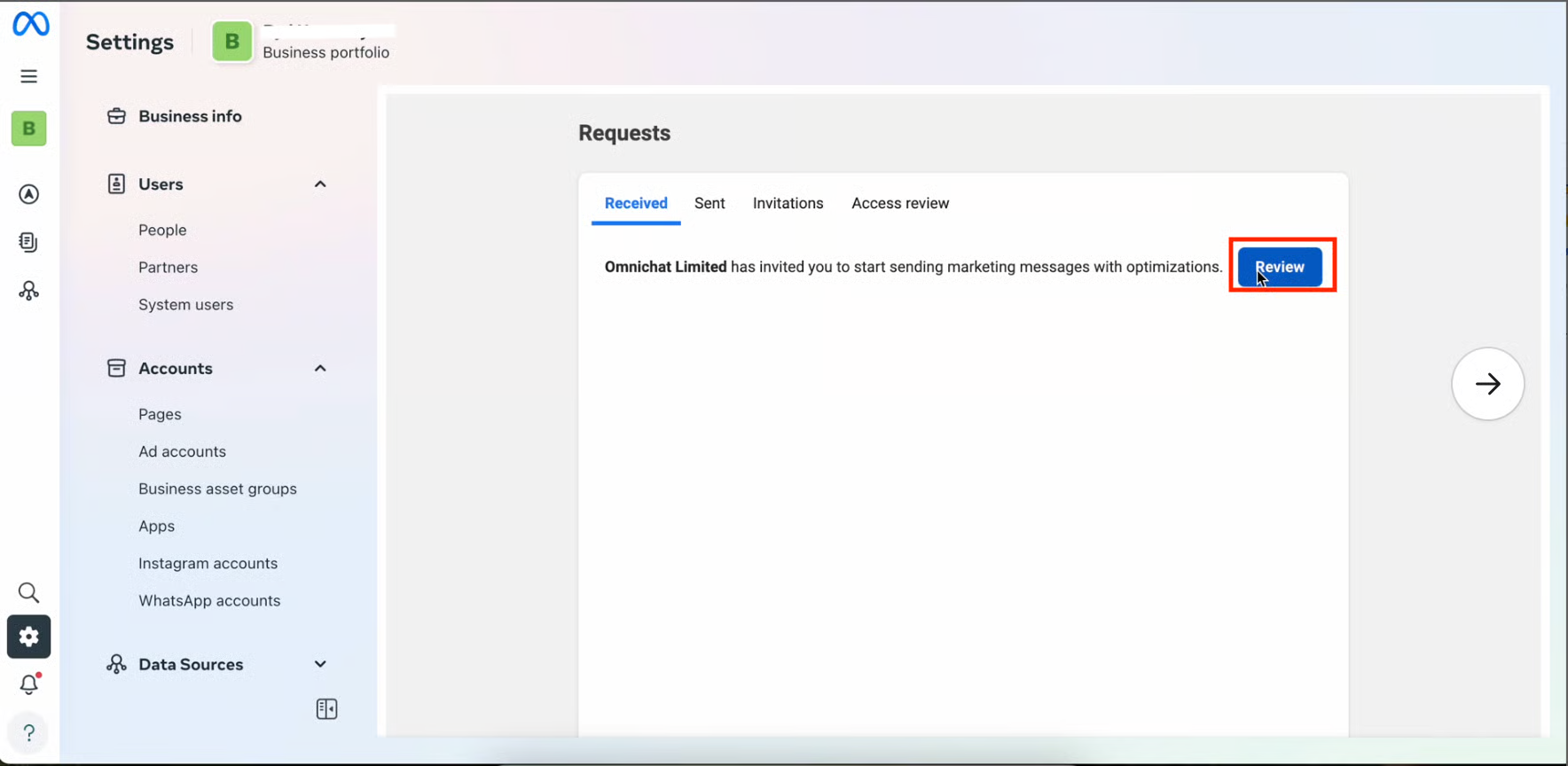 點擊 Meta 郵件中的「Get Started（開始使用）」按鈕，進入 Meta Business Manager 平台，並點選「Review（檢視）」。