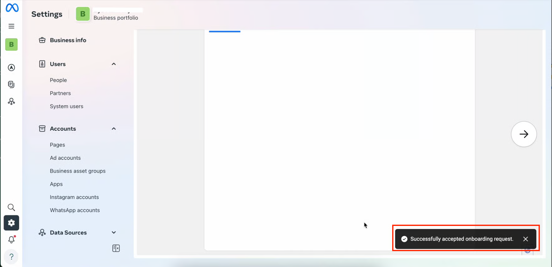 請提醒您的 BM 最高權限管理員 **查收信件**，並依據 Meta 信件中的連結完成 **授權流程**