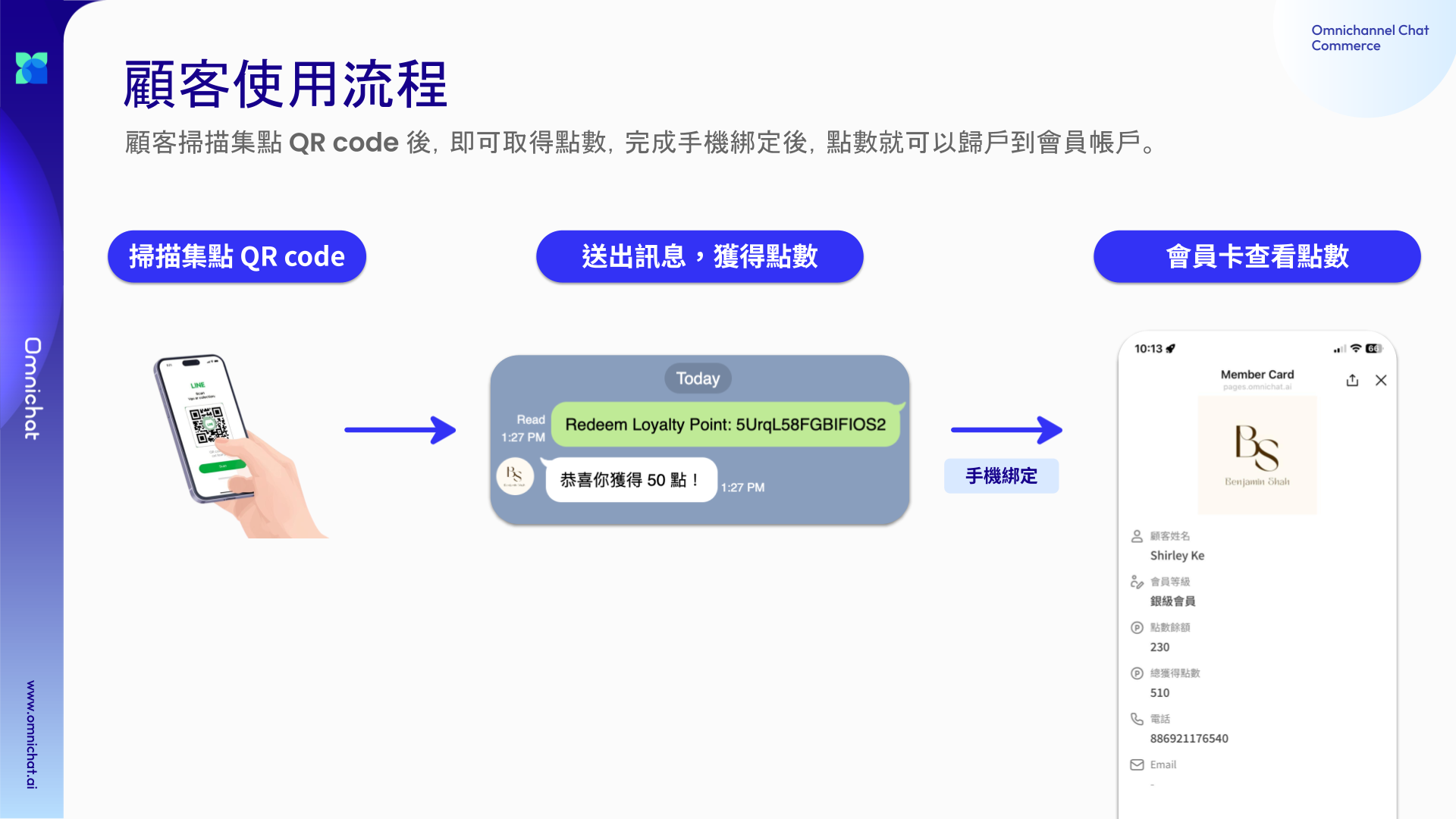* **顧客掃碼集點**：支援 LINE、WhatsApp，掃描 QR Code 即可獲得點數。