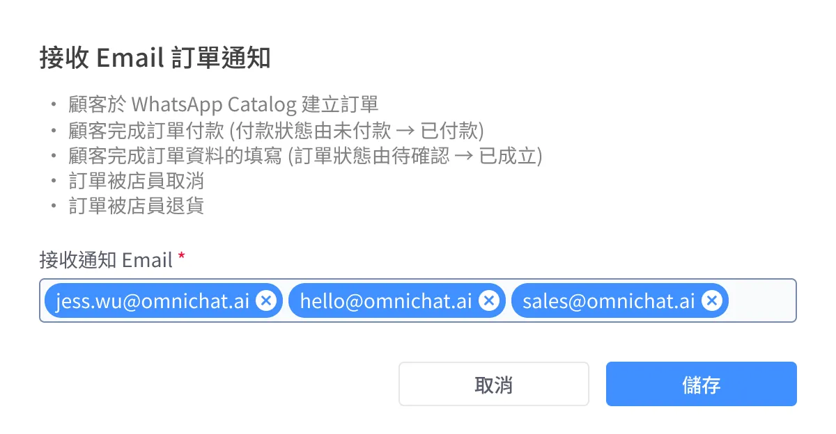 顧客於 WhatsApp Catalog 建立訂單 Email 通知示意圖